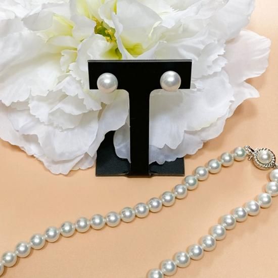 直径10mmのイヤリングです。イヤリングの場合あまり小さいと耳たぶの金具部分が目立ってしまうので一番さりげない小さなパールのイヤリングのサイズはどれ?と聞かれたら絶対10mm!とお答えしています。このクリップタイプのイヤリング金具は日本で売られているものと少し違います。耳の裏側にあたる部分が長く、耳たぶにぐっと挟んだ後パールを少し下に向けるようにすると前から見てピアスをしているように見えます。