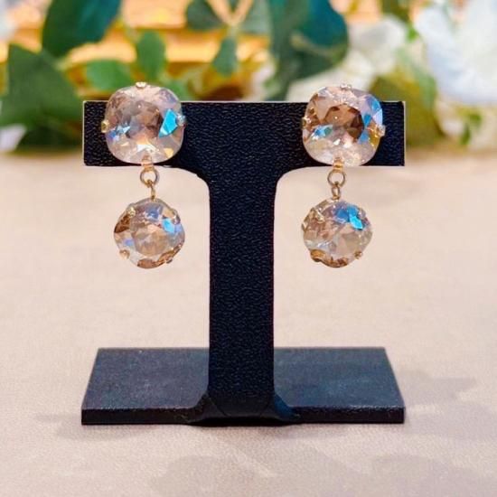 12mm×12mmの四角いクリスタルの下に10mm×10mmの小さなクリスタルがかわいく揺れるピアスです。