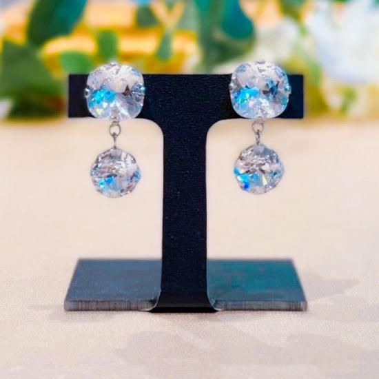 12mm×12mmの四角いクリスタルの下に10mm×10mmの小さなクリスタルがかわいく揺れるピアスです。
