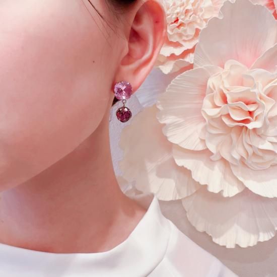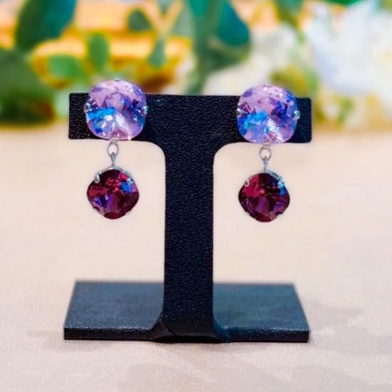 12mm×12mmのバイオレットクリスタルの下に10mm×10mmの小さなアメジストクリスタルがかわいく揺れるイヤリングです。