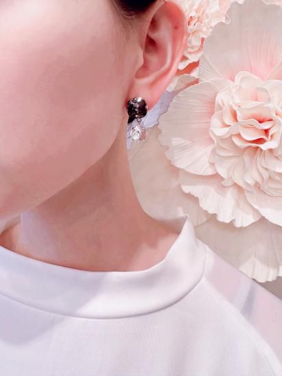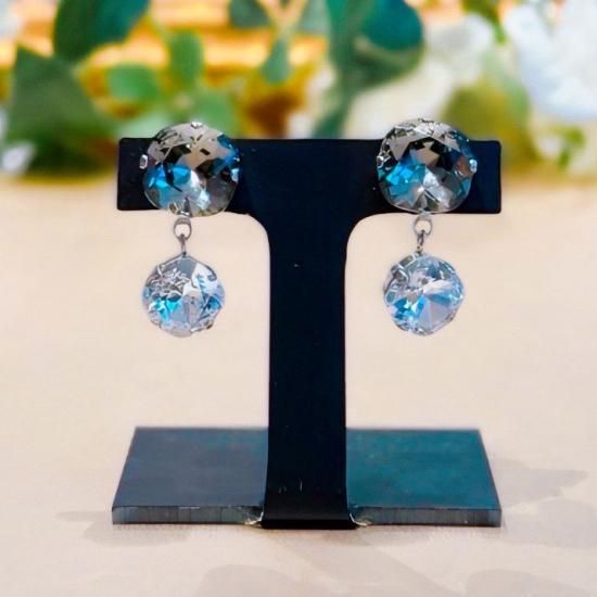 12mm×12mmの四角いクリスタルの下に10mm×10mmの小さなクリスタルがかわいく揺れるイヤリングです。