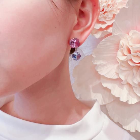 12mm×12mmのバイオレットクリスタルの下に10mm×10mmの小さなブルークリスタルがかわいく揺れるイヤリングです。